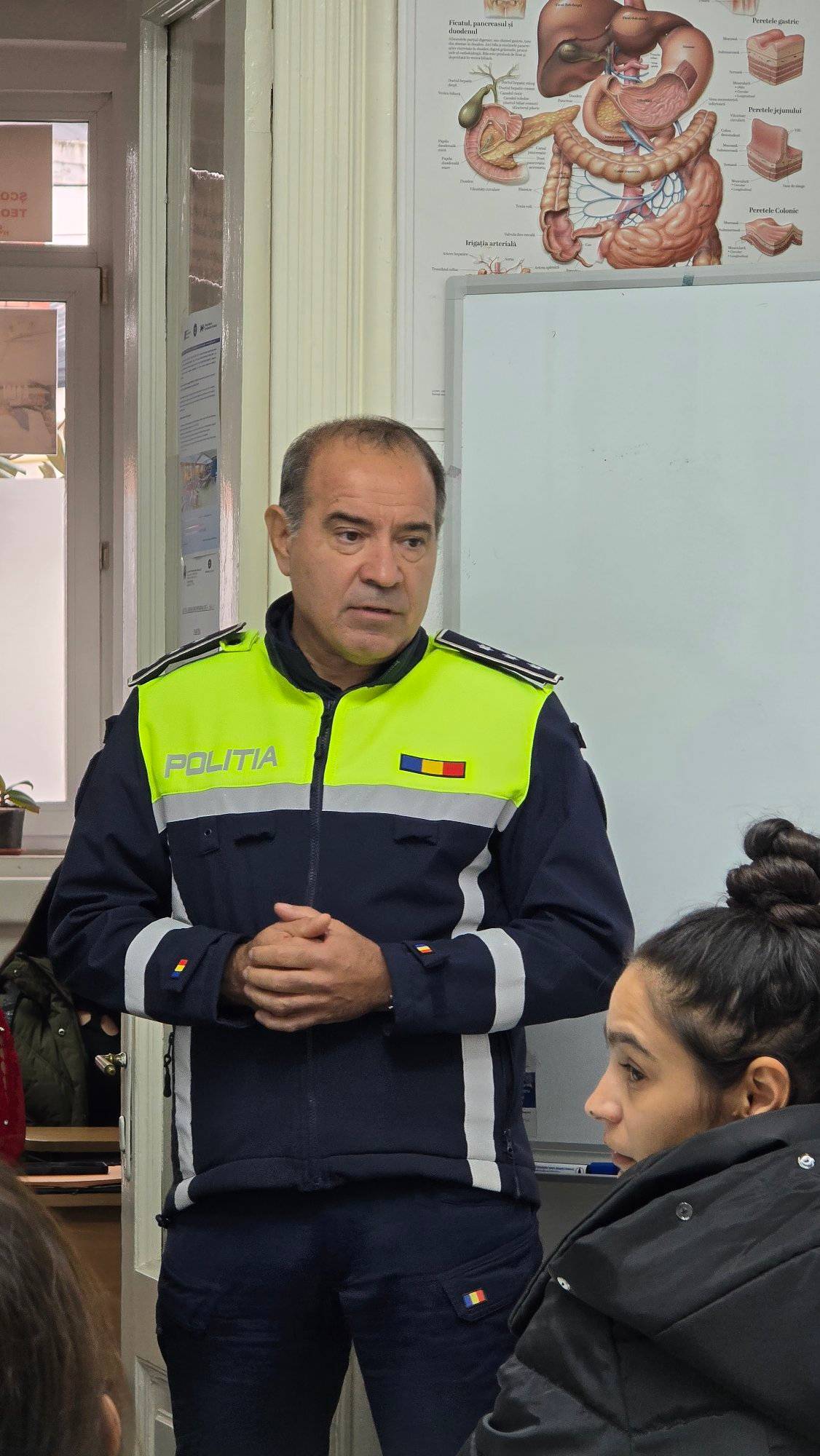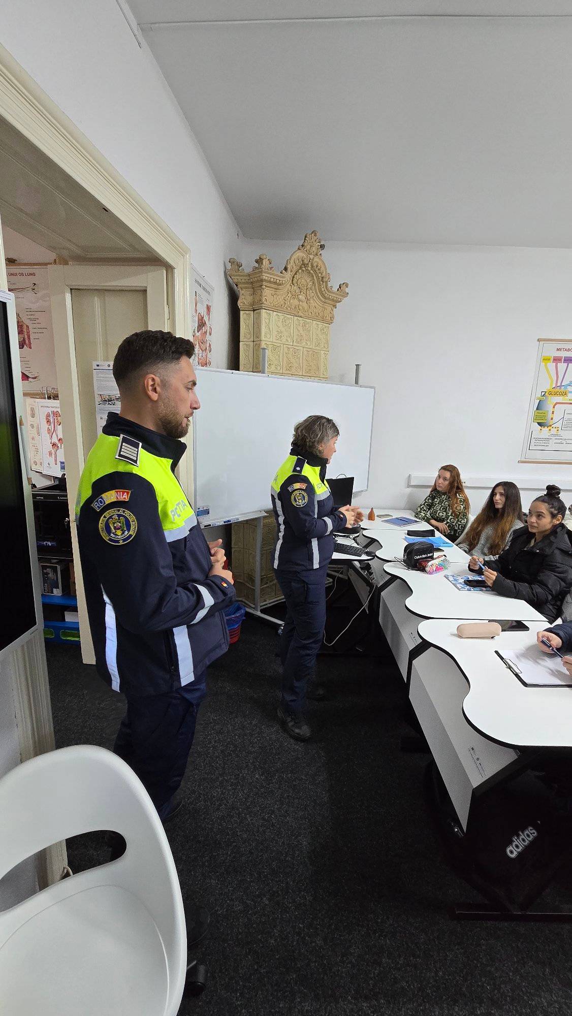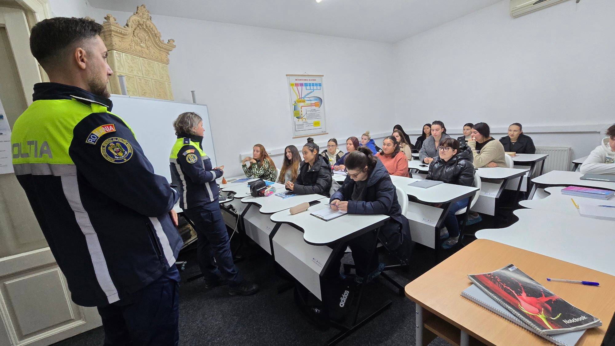 Azi la Școala Postliceală Teologico-Sanitară “Sfântul Iosif” din Craiova, reprezentanții Inspectoratului de Poliție Județean Dolj au prezentat aspecte legate siguranța rutieră, prevenirea traficului de droguri și violența domestică. La activitate